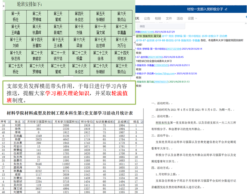 为扎实推进党史学习教育,引导和鼓励支部全体党员、入党积极分子加强政治理论学习,养成良好学习习惯,形成浓厚学习氛围,2021年4月6日-5月6日,支部在全体党员和入党积极分子范围组织开展“政治理论学习强化月”活动。活动期间,党员每日轮岗值班在支部QQ群定期推送党史学习内容、党史知识竞赛等相关内容,逐步引导同学们利用好学习强国、青年大学习等平台,积极主动参与党史学习教育,自觉深入学习党的理论、方针、政策。