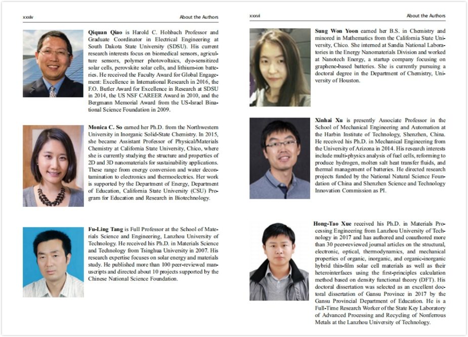 省部共建有色金属先进加工与再利用国家重点实验室先进材料计算与设计团队参与编著的英文专著《Nanostructured Materials for Next-Generation Energy Storage and Conversion:Photovoltaic and Solar Energy》(新一代能量存储及转换纳米材料:光伏与太阳能)于2019年12月由国际知名的德国SPRINGER出版社出版。该书汇聚了来上海交通大学、美国德克萨斯农工大学、美国加州大学、澳大利亚麦考瑞大学、日本国立材料研究所(NIMS)等国内外知名学术研究机构专家学者的研究成果,历时3年合作完成。