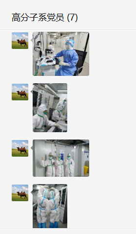 2020年3月27日,高分子党支部开展了一次主题为“我眼中的防疫工作的感动瞬间”的可视化分享主题党日活动。活动以微信群的形式开展。在活动筹备阶段,党员们在群内分享了一些可视化瞬间,有从抖音、头条、人民日报、腾讯视频、微信视频号等来源各种新闻视频,也有防疫期间自己或身边朋友参加相关工作的照片。集体活动后,党支部书记李慧连线身在美国访学的支部党员张龙老师,对他在国外的生活和学习表达关心,国外党员同志积极响应微信群的党日主题活动,表达了对祖国防疫工作的赞美。