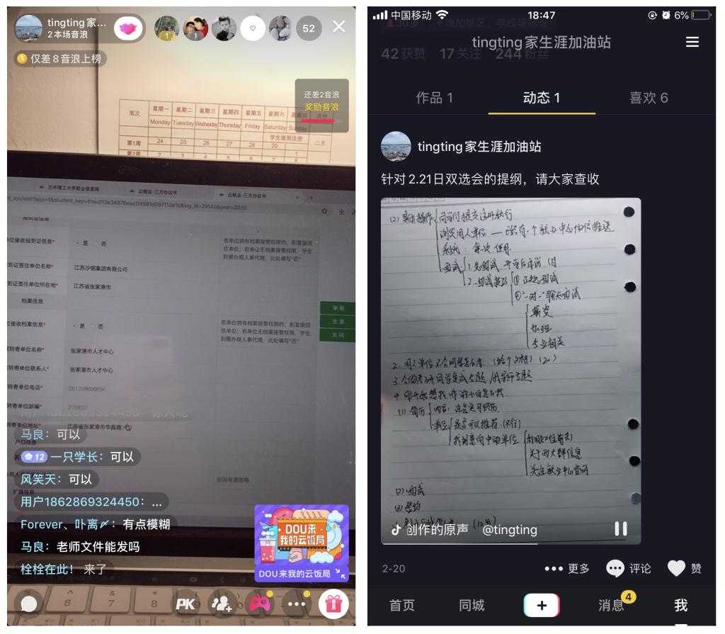 思想政治教育、管理服务是始终贯穿辅导员日常的工作。兼任思政课教学的刘舒婕老师在QQ课堂上带领同学们一起感受疫情防控中展现出的中国力量、中国速度,让同学们更加坚定了“四个自信”。分管就业的杨文婷老师及时转变工作思路,通过各种线上“隔空”方式在就业指导、职业规划、考研复试等问题上尽全力给予毕业生帮扶和指导,她利用抖音平台开展不同主题的直播,“面对面”的帮助同学们转观念、指导员工网签、指导员工利用好就业中心网上招聘平台、传授网上面试技巧和等各类应聘问题…,“杨老师生涯加油站”成了同学们心中的网红。而与此同时,支部书记和班主任也第一时间通过就业帮扶主题班会和党日活动为同学们的就业加油助力。