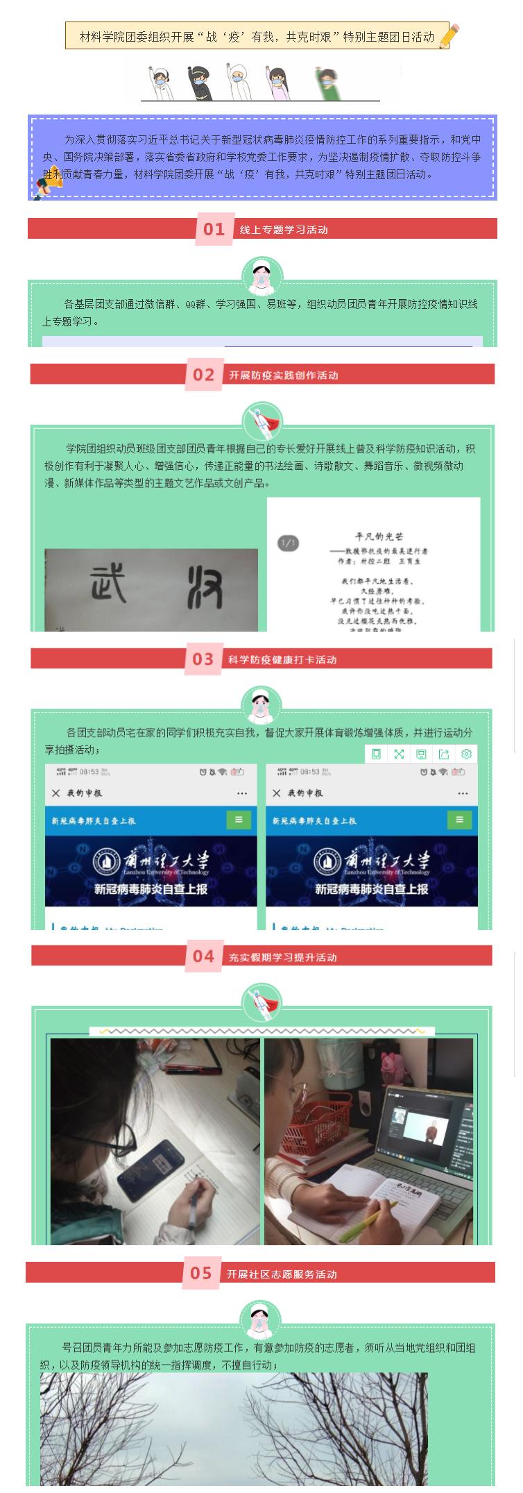 疫情和假期让辅导员、班主任与同学们在空间上保持距离,但对同学们的思想政治教育和关心爱护不因病毒而隔离,不因时空而分割。大家心往一处想,劲往一处使,充分发挥网络、组织、实践、心理和服务等育人功能,切实践行思想政治工作者的初心和使命。疫情发生以来,公司各员工党支部、分团委和各年级、各班级通过微信公众号、QQ群、微信群、钉钉等网络渠道,积极做好党和国家防疫理论政策的宣讲,宣传疫情防治知识、疫情防控法律知识等,把教育部《致全国老员工的一封信》传达给每一位同学。各党支部相继召开线上主题党日活动集中学习中央、省委有关疫情防控重要会议精神和习近平总书记讲话精神,学习优秀党员在疫情防控中的感人事迹,党员们积极捐款,通过主题党日活动让员工党员更加明确自己肩负的责任和使命。各团支部组织开展“战‘疫’有我,共克时艰”主题团日活动,集中学习政策精神、普及防疫知识,组织各类书法绘画、微视频等原创作品征集活动,开展社区志愿服务活动等,引导青年团员为疫情防控贡献青春力量。