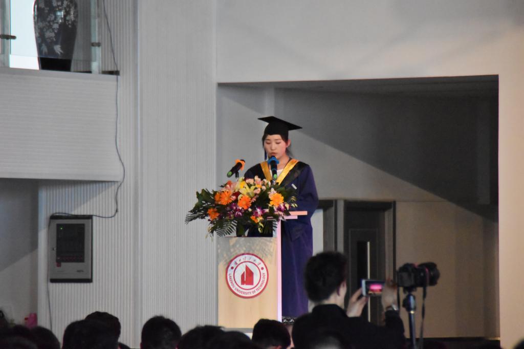 接下来,毕业生代表硕士研究生付小月代表全体毕业生发表毕业感言,她谈到“在老师的悉心指导下,在母校为我们创造的良好科研环境中,年轻的我们在这里成长,在这里,我们不断攀登学术的高峰。”在怀念校园生活的同时她讲到“未来,无论身在何方,有着怎样的机遇,作为工大学子都会时刻谨记,艰苦奋斗,自强不息,求真务实,开拓创新的红柳精神!”,如果说毕业生代表的发言更多饱含着的是大家对母校的不舍,那么师长的临别赠言则更多寄予的是对同学们的殷切期望。