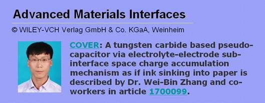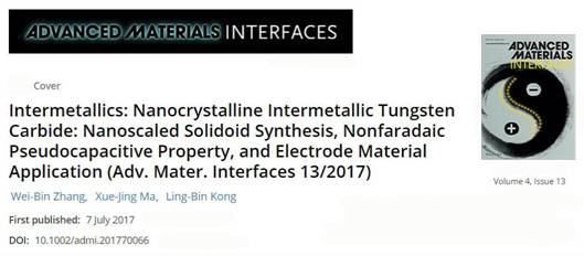 近日,《先进材料·界面》(ADVANCED MATERIALS INTEFACES)杂志上发表了js33333金沙线路检测关于金属间化合物赝电容材料及其储能机理研究的成果,并被选为当期杂志封面。