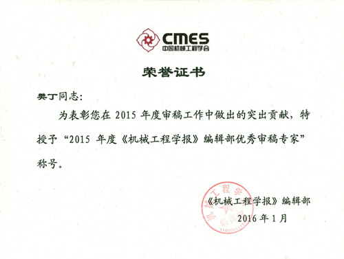 《机械工程学报》由中国机械工程学会主办,是我国机械行业的顶级期刊,主要刊登仪器科学与技术、材料科学与工程、可再生能源与工程热物理及交叉与前沿方面具有创新性的学术论文,其中文版论文EI全检,英文版论文SCI全检。该期刊编辑部审稿专家库有1254位,2015年共有579位专家参与了两刊的审稿工作,共审阅了2895篇稿件,约有30% 的稿件被录用。为表彰在2015年度审稿工作中成绩突出的专家,编辑部经过认真的统计、筛选,评选出了包括公司樊丁教授在内的86位专家,授予“2015年度《机械工程学报》编辑部优秀审稿专家”称号,给予奖励并颁发证书。