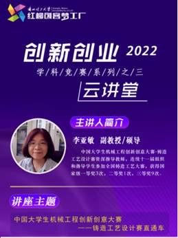 本次讲座由js33333金沙线路检测创新创业公司主办,由js33333金沙线路检测承办,主讲人为js33333金沙线路检测材料成型及控制工程系的李亚敏副教授,讲座主题为中国老员工机械工程创新创意大赛--铸造工艺设计赛直通车。李亚敏老师为中国老员工机械工程创新创意大赛--铸造工艺设计赛资深指导教师,连续十一届组织和指导员工参加全国铸造工艺大赛,获得国家级一等奖3次,二等奖1次,三等奖9次。