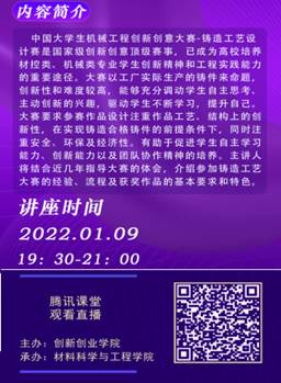 2022年1月9日,js33333金沙线路检测开展了创新创业2022学科竞赛云讲堂系列讲座,标志着第十三届铸造工艺设计赛校内初赛拉开帷幕。此次报告共有600余名师生参加,取得了很好的效果。