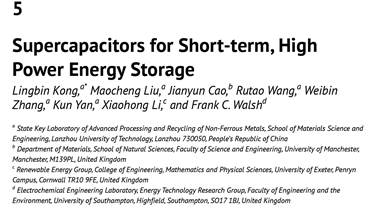 孔令斌教授长期从事超级电容器的研究,是该领域的资深研究者,承担了第5章节《Supercapacitors for Short-term, High Power Energy Storage》的撰写。在该章节中,作者主要介绍了超级电容器的储能原理、电极材料以及器件的研究和应用现状,并对超级电容器的未来发展方向提出了建议。