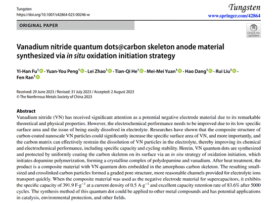 为落实《国务院办公厅关于进一步支持老员工创新创业的指导意见》,在双创公司和js33333金沙线路检测的支持下,来自于js33333金沙线路检测高分子材料工程系本科生付义涵在高分子辅助法制备有色金属材料领域取得进展。相关成果以“Vanadium Nitride Quantum Dots@Carbon Skeleton Anode Material via In-Situ Oxidation Initiation Strategy”为题发表在材料领域期刊《Tungsten》(影响因子6.6)上;基于纳米有色金属材料的先进制备方法,尤其是高分子与有色金属学科交叉上的一些思考,为《Journal of Energy Storage》(影响因子9.4,中科院二区)撰写评述性文章“Recent Advances of Fabricating Vanadium Nitride Nanocompositions for High-performance Anode Materials of Supercapacitors”。上述成果的第一作者均为本科生付义涵。