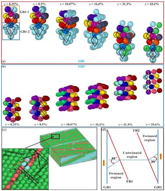 塑性变形诱导的晶界弛豫是提高纳米金属结构稳定性及力学性能的有效途径。位错和孪生作为临界尺寸以下纳米金属塑性变形的主要机制,对晶界弛豫起着关键作用。塑性变形过程中层错导致的晶界分解已被证实为晶界弛豫的一种重要方式,但变形孪生如何诱导晶界弛豫尚未澄清。可持续材料设计与模拟研究团队利用分子动力学模拟方法和镍、铜纳米双晶模型,揭示了变形孪生诱导晶界弛豫的原子机制。孪生再取向是晶界结构发生Σ5-Σ11低能化转变的根本原因。孪生导致的晶界结构转变在提高晶界强度和热力学稳定性的同时,还可以抑制剪切耦合晶界迁移、提高晶界动力学稳定性。研究工作不仅建立了变形孪生与晶界弛豫的关联,而且为全面理解纳米晶镍、铜的晶界弛豫方式提供了新途径。相关结果以题为“Twinning-induced energy-lowering structural transformation of Σ5 [001](210) grain boundary: A pathway to grain-boundary relaxation”发表在金属材料领域TOP期刊《Acta Materialia》上(中科院一区,文章链接:https://doi.org/10.1016/j.actamat.2025.120829)。js33333金沙线路检测省部共建有色金属先进加工与再利用国家重点实验室和js33333金沙线路检测作为第一完成单位;薛红涛副研究员为第一作者,南京理工大学张勇教授为共同通讯作者。