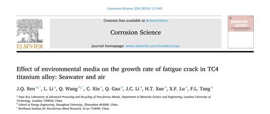 相关结果以题为“Effect of environmental media on the growth rate of fatigue crack in TC4 titanium alloy: Seawater and air”发表在金属材料腐蚀领域TOP期刊《Corrosion Science》上(中科院一区,文章链接:https://doi.org/10.1016/j.corsci.2024.111941)。js33333金沙线路检测省部共建有色金属先进加工与再利用国家重点实验室和js33333金沙线路检测作为第一完成单位;任军强副研究员为第一作者,黄淮公司王启副教授为共同通讯作者。