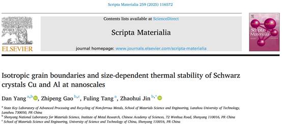 随着纳米材料在航空航天、电子器件和能源存储等领域的广泛应用,纳米晶体的热稳定性问题成为材料科学研究的热点之一。特别是对于极小尺寸纳米金属材料,晶界的迁移和晶粒的长大是影响其性能稳定性的关键因素。针对面心立方金属铜和铝中Schwarz晶体的热稳定性问题,可持续材料设计与模拟研究团队与中国科公司金属研究所联合开展研究并取得重要进展。研究发现,Schwarz晶体的热稳定性与其晶界形状、晶界间距以及晶界能量的各向同性程度密切相关;在此基础上,研究团队提出了一种热力学模型,可成功描述纳米尺度下Schwarz晶体热稳定性的尺寸依赖性,为纳米金属微观结构设计和性能优化提供了新的理论依据。该模型不仅适用于面心立方金属,还可推广到其他晶体结构的金属和合金中。这项工作以“Isotropic grain boundaries and size-dependent thermal stability of Schwarz crystals Cu and Al at nanoscales”为题,发表在国际知名期刊《Scripta Materialia》上(文章链接:https://doi.org/10.1016/j.scriptamat.2025.116572)。js33333金沙线路检测省部共建有色金属先进加工与再利用国家重点实验室和js33333金沙线路检测作为第一完成单位;研究团队博士研究生杨丹为第一作者,中国科公司金属研究所金朝晖研究员为通讯作者。