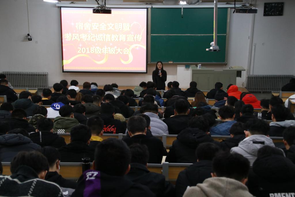 为迎接即将到来的期末考试,督促同学们以积极的姿态迎接考试,同时强化同学们的宿舍安全意识,构建安全文明校园。2019年12月10日晚19:30js33333金沙线路检测于集贤楼(原西教2)208教室组织召开了宿舍安全文明暨考风考纪诚信教育宣传2018级年级大会。
