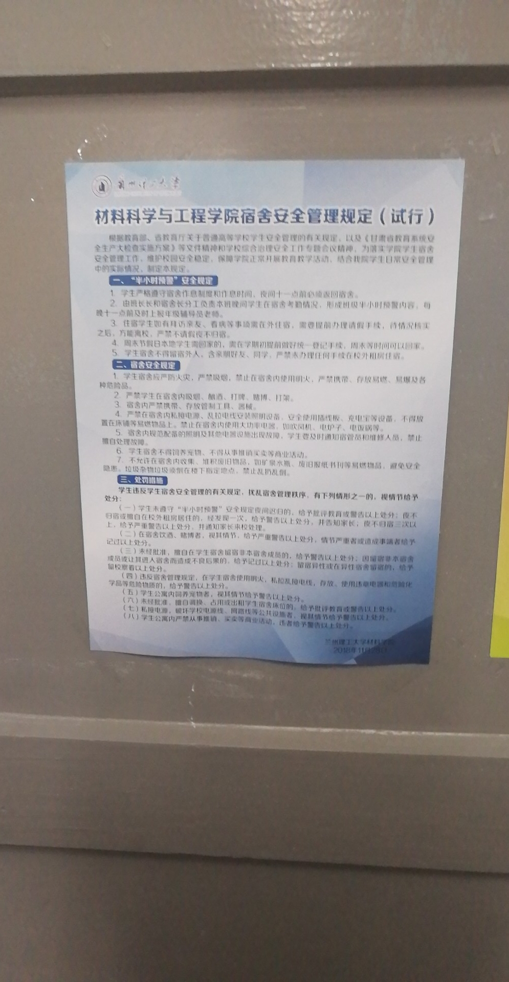 为加强员工宿舍管理,规范员工行为,提高同学们的安全意识,落实公司员工宿舍安全管理工作,在2019年秋季学期的第7周,js33333金沙线路检测组织开展了19级新生学习《js33333金沙线路检测宿舍安全管理规定(试行)》的活动。