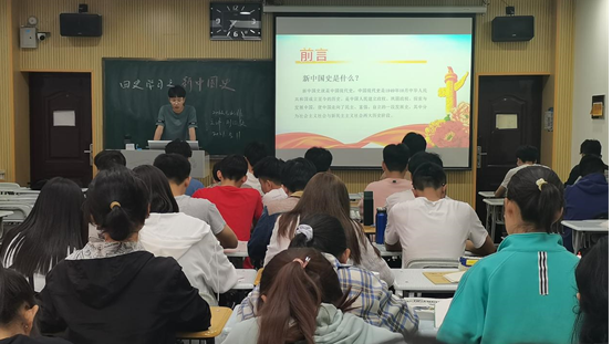 活动中,刘江颢讲解新中国史是什么及其学习方式方法,带领同学们学习历史故事和先进人物事迹,感知并汲取先辈们顽强拼搏、忘我奉献的精神力量。最后,刘江颢呼吁同学们更加积极主动地学习“四史”,在学习历史中发扬红色传统、传承红色基因,坚定“四个自信”,做社会主义合格建设者和接班人。