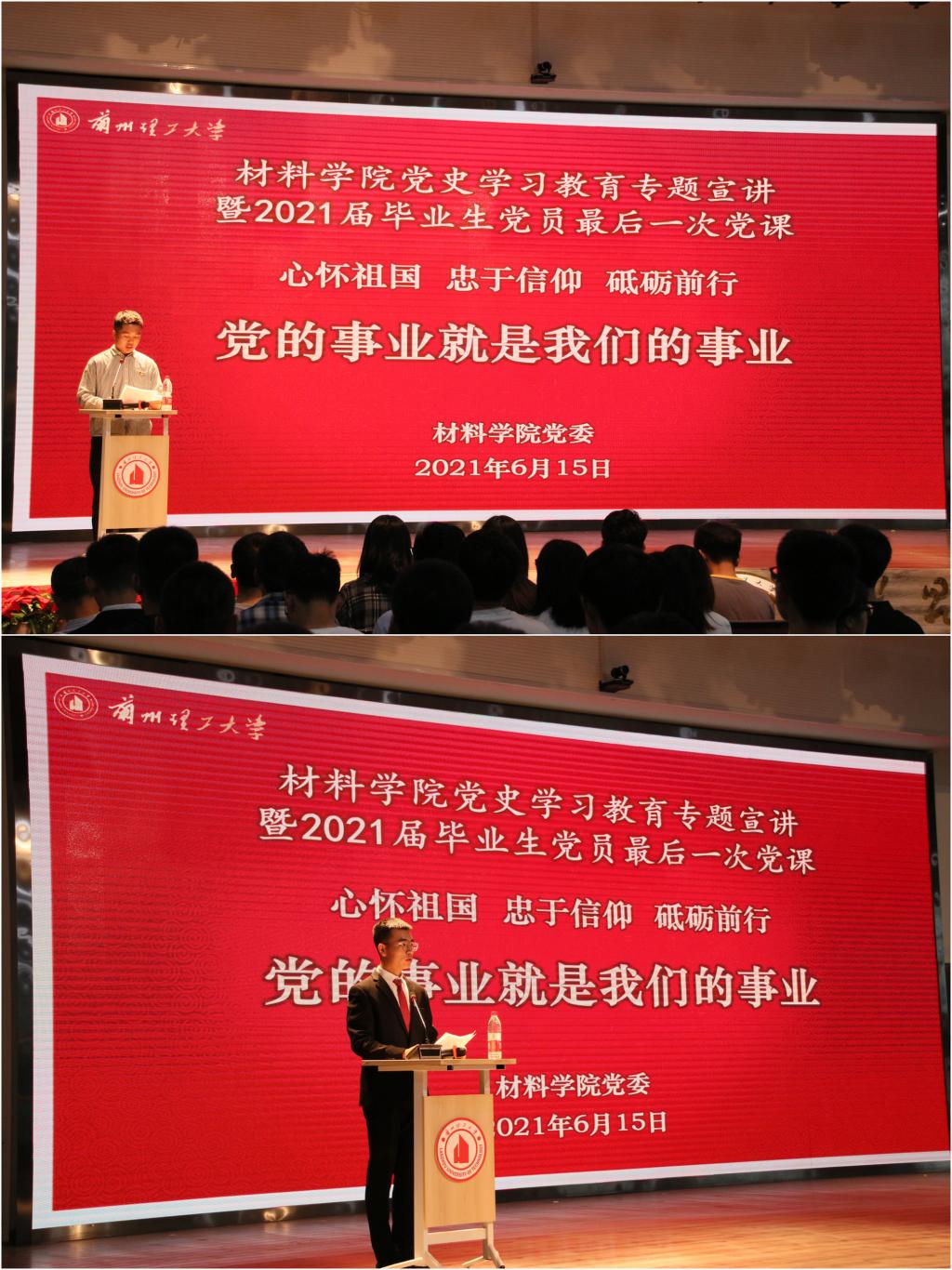 2021年校级优秀共产党员候选人17级金材二班李劲伟同志代表毕业生党员发言,他呼吁广大全体党员继续以一名共产党员的高标准严格要求自己,努力学习、扎实工作,在各自的学习工作岗位取得更大的成绩,发扬母校“艰苦奋斗、自强不息、求真务实、开拓创新”的红柳精神,奉献社会、报效国家。18级材控二班黄健同志代表新党员发言,他讲到通过党史学习、疫情防控、国防安全等方面具体事例激励新时代青年党员勇于承担重任、牢记初心使命、接续奋勇前行,并祝福毕业生党员以信仰为歌,以奉献为歌,以奋斗为歌,投身于中华民族伟大复兴的历史进程中。