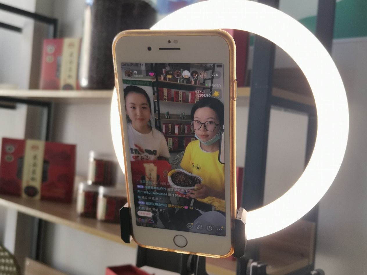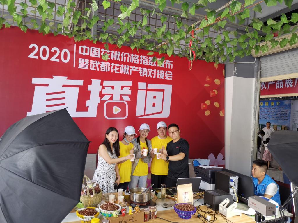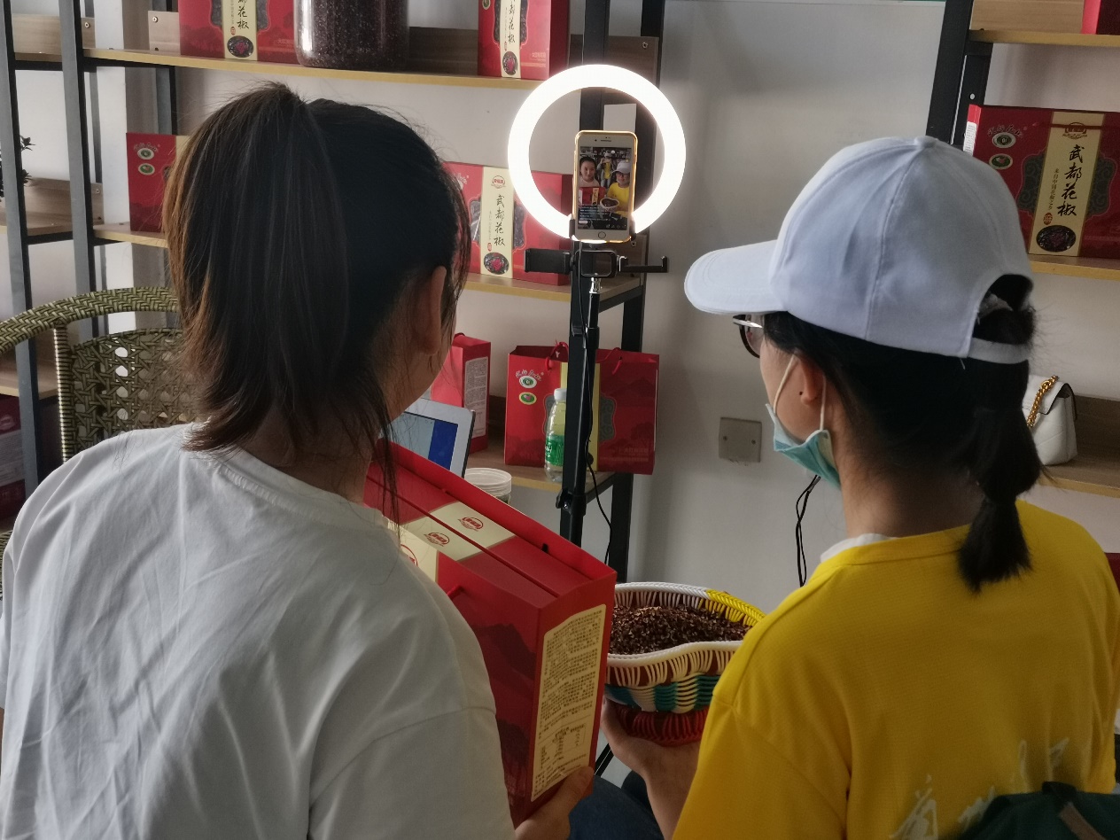同时间段,实践二队队花椒会展参与直播带货。进入直播间,参与直播,对实践队队员来说是新颖的,是陌生的,但也是充满吸引力的。因为在直播可以见证花椒被宣传推广到最后销售出去的全过程,也可以见证销售花椒的主播们工作的全过程,更可以在屏幕的这边把花椒推广到屏幕的那边。在花椒会展的时候,实践队队员发现线上直播带货成了花椒等农产品推广和销售环节中一项重要的催化剂,线上销售也成了销售环节的中流砥柱。用当代流行的直播销售方式,将农产品推广得更远,这是科技兴农,推动经济增长,助力农民脱贫的方法之一。