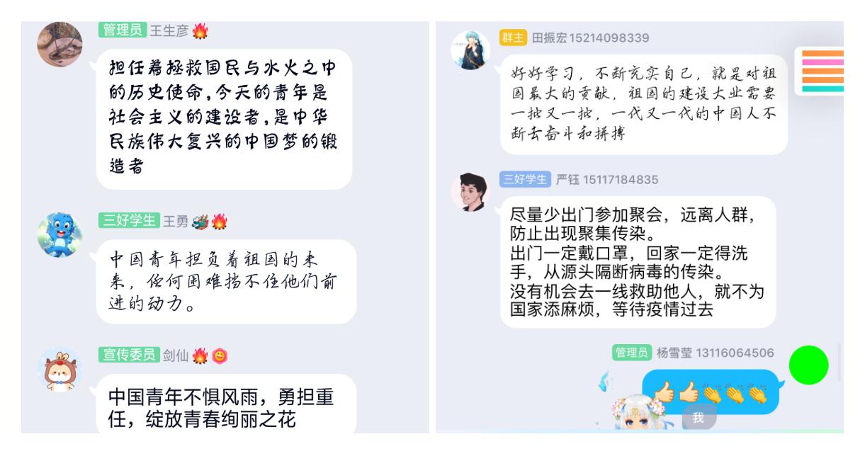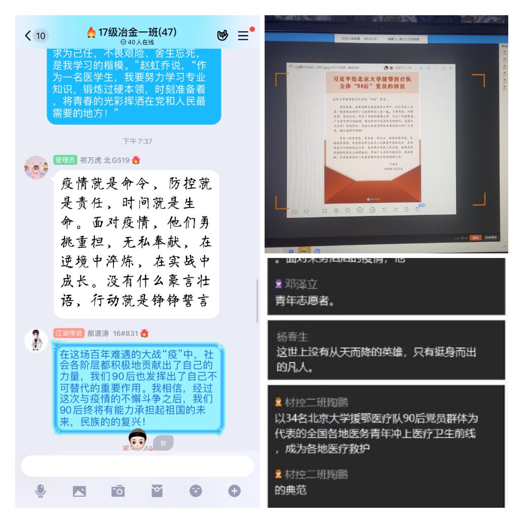 4月8日-4月14日,js33333金沙线路检测团委各团支部开展学习《习近平总书记给北大援鄂医疗队全体“90后”党员回信》主题团日活动暨线上团员教育评议。团支书以共享屏幕的方式,带领支部全体同学学习《习近平总书记给北大援鄂医疗队全体“90后”党员回信》原文。学习结束后同学们结合学习内容与疫情防控围绕坚定理想、练就本领、敢于担当进行深入讨论。