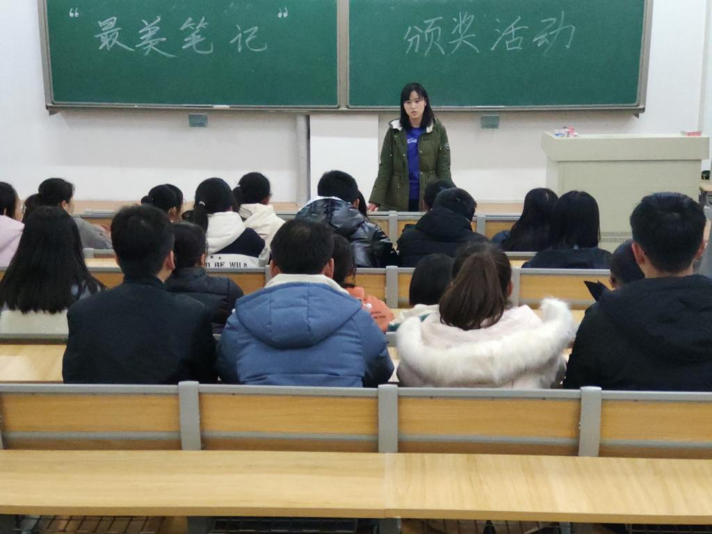 颁奖仪式开始,辅导员汪老师给了同学们一些学习上的指导和鼓励,使同学们更加清楚如何去做笔记,明白做笔记的目的何在。接着汪老师给本次最美笔记大赛的获奖同学颁发了获奖证书和奖品。