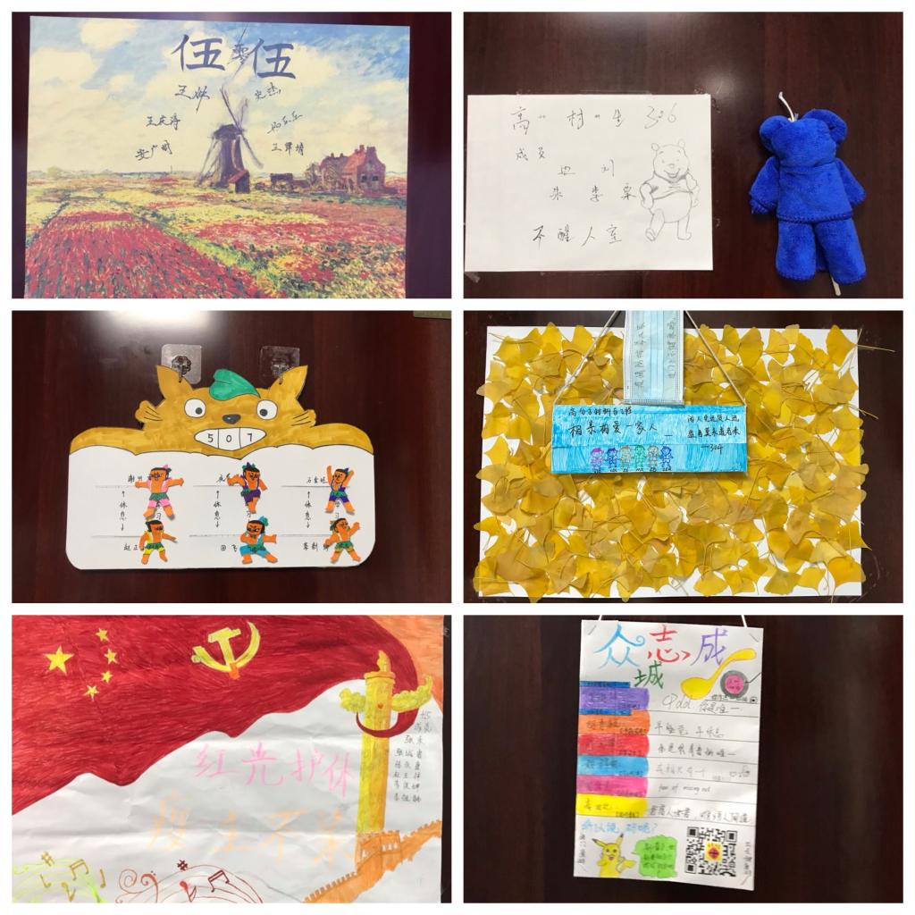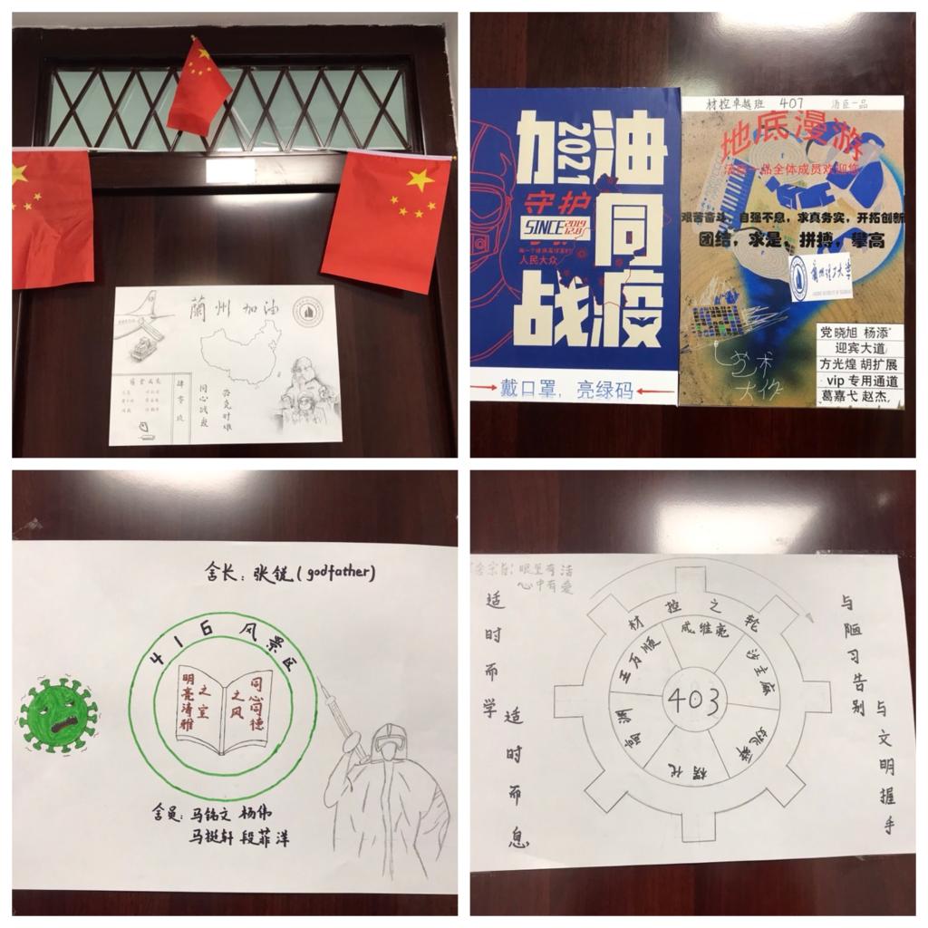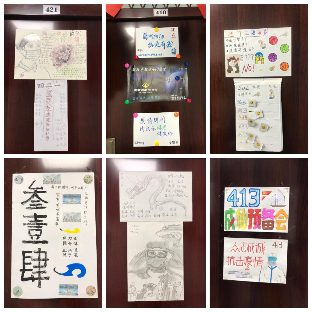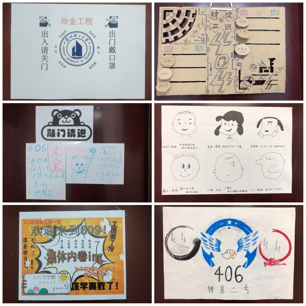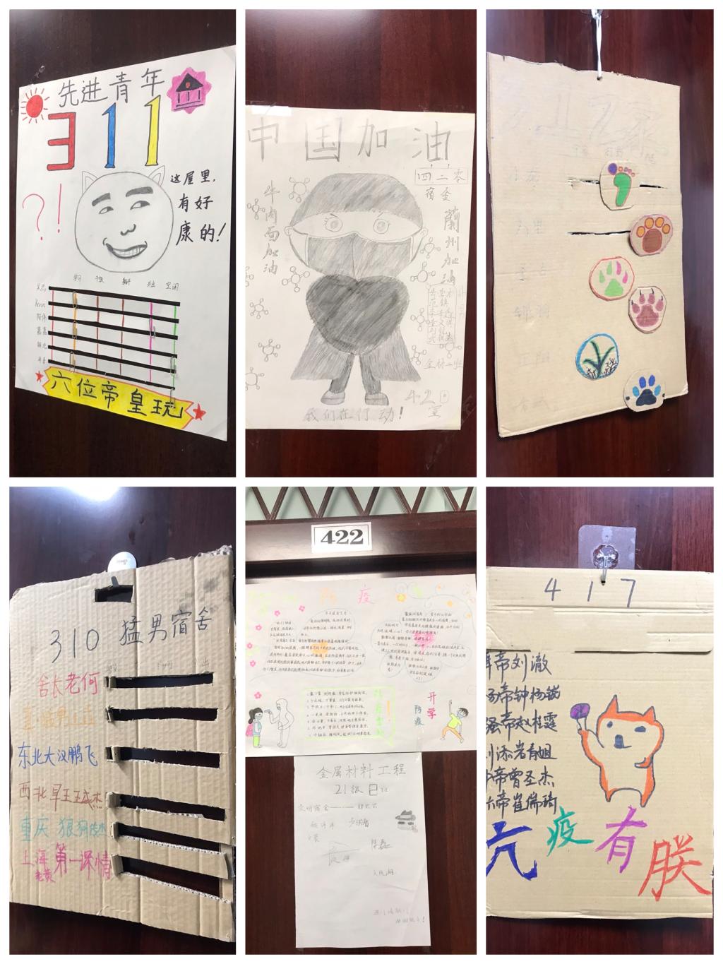 各班级以宿舍为单位,通过开展线上文艺展示主题班会、趣味短视频拍摄、寝室门标设计等趣味活动,让同学们在疫情期间排解心理压力,充实疫情期间课余生活,用健康平和的心态面对疫情遭遇期,让同学们自豪地告知担心的家长,“放心吧,公司的疫情防控工作做得很好,我们在寝室一点也不无聊!”每一张门标、贴纸,每一段寝室趣味视频、照片,每一个摆件、小绿植背后,都是一个个灵感的迸发,思想的碰撞以及材料学子对生活的热爱。“汤臣一品”、“铸星二号”等对未来生活的期许,也有“葫芦兄弟”、“成仙预备会”等积极乐观的生活态度,更有“同心战疫,共待花期”、“中国加油”、“蘭州加油”等对抗疫战士的感谢及对打赢此次疫情防控遭遇战的坚定信念,在同学们眼中,宿舍门牌不再是一串单调的代码数字,而是他们奇思妙想、脑洞大开创作的一方空间。