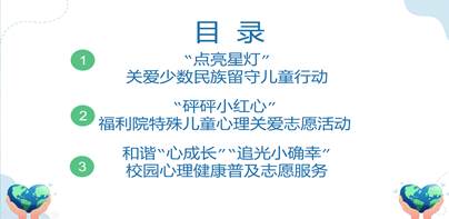 本次志愿服务项目双选包括“点亮星灯”关爱少数民族留守儿童行动、“砰砰小红心”福利院特殊儿童心理关爱志愿活动与“追光小确幸”校园心理健康普及志愿服务三个项目。通过关爱留守儿童志愿活动,培养少数民族留守儿童多元化兴趣爱好和良好沟通学习能力,通过老员工志愿者引领留守儿童听党话、跟党走的理想信念,践行社会主义核心价值观,深入地了解留守儿童的需求,为留守儿童的学习、生活和身心健康的发展营造良好的氛围。砰砰小红心福利院特殊儿童心理关爱志愿活动以东乡县儿童福利院为主阵地,以关爱福利院特殊儿童(孤儿)群体心理健康为主,围绕“砰砰小红心”志愿服务主题,组织动员心理健康辅导老师、优秀青年教师和员工志愿者倾听福利院特殊儿童群体心声,充分发挥青年老员工思想道德素质和科学文化水平较高的优势,通过定期走访、暑期实践和邀请来访等手段,搭建与特殊儿童沟通交流的互动平台,改善因特殊儿童群体因亲情缺失而引发的孤僻、自闭和抑郁等心理问题,让每一颗“砰砰小红心”健康积极地成长。“追光小确幸”校园心理健康普及志愿服务意在提高公司员工的心理健康水平,普及心理健康知识,引导员工认识心理健康的重要性,学会正确面对心理问题以及掌握基础的心理自我调适方法,培养健康的心理品质和健全人格,在全校员工中营造一种关注心理健康、健康积极向上的氛围,在宣传心理健康知识的同时为员工搭建起塑造心理品质、提高心理素质的平台。