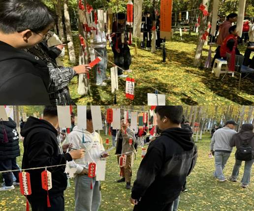 两委会还特别邀请公司墨研月书画协会和手工云剪纸协会,在银杏林中展示优秀书法作品及剪纸作品,同学们在银杏林中学习书法和剪纸技巧,感受中华优秀传统文化带来的文化沁润。