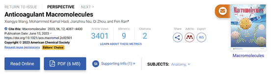 js33333金沙线路检测在生物医用高分子膜材料与器件方向取得了进展,相关成果相继在高分子领域权威期刊《Macromolecules(中国科公司1区;影响因子5.5)上发表。该成果展示了课题组在抗凝血大分子结构设计和植入式储能器件研发领域的研究方法和开发思路。论文第一作者分别为js33333金沙线路检测博士生王相雅和尉梅梅,通讯作者均是冉奋教授。