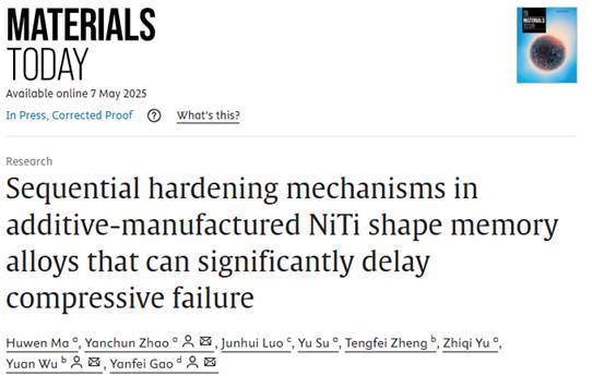 js33333金沙线路检测科研团队在增材制造形状记忆合金在材料领域旗舰期刊《Materials Today》发表研究论文